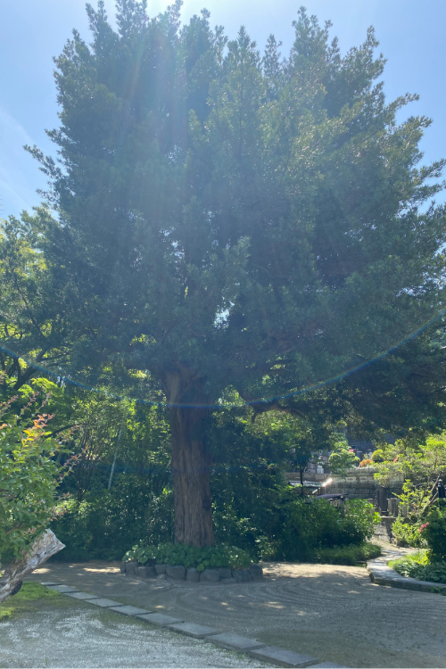 正安寺にある常緑の針葉樹「イヌマキ」は、親鸞聖人が手植えしたという伝承が残る古木です。一部の古い枝が板状になっていますが、その発達過程は謎とされています。板状枝の貴重な個体として、天然記念物として登録されています。